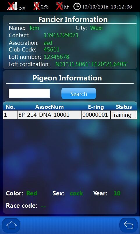 The Loft No. and Fancier name information is assigned and entered by your local agent or club. The GPS is obtained by the real time GPS module in this clock. If there is no GPS signal, the field will be blank and the communication will transfer null coordination value.