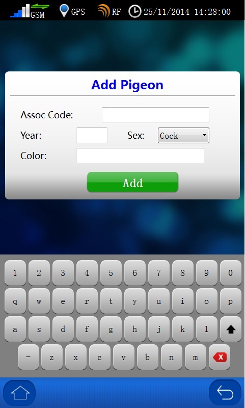 The Fanciers can add their own pigeon by click on the Add button, a new Add Pigeon window will popup. You can key in the pigeon information of Association Code (band ring number), Year, Sex, and Color by using the in-display keyboard. Press Add button to complete the adding action. If you want to assign your bird with chip rings, you need to connect to the Club Antenna for this operation. Note: Only the assigned birds can synchronized to Club manager.