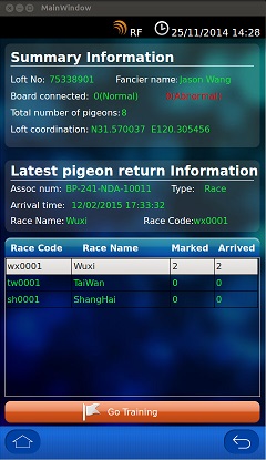 The second part of the Home Page is the latest arrival pigeon information, such as the bird’s Association number, Type: race or training, Arrival time and detail race information.