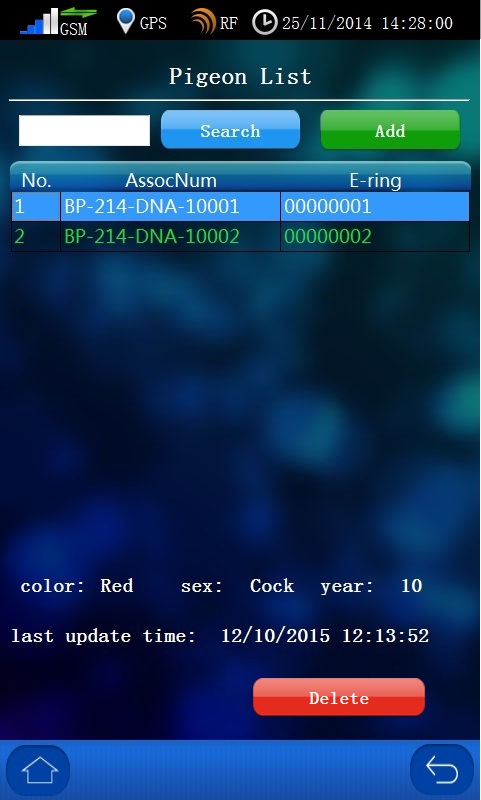 There is a search panel on top of the pigeon information. Click on the Search, an in-display keyboard will pop up in the lower side. The comprehensive search engine provides quick and easy way to locate the birds in the member’s loft. By keying-in part of the bird’s life ring number, the search engine will show all birds that meet these searching conditions.