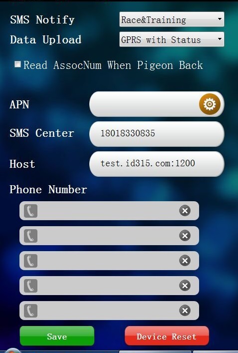 SMS notify is to set iPigeon sending the race or training information of your bird via SMS. In this function you can select Disable, Training, Race, Training and Race according to your need. The SMS can send SMS up to 5 mobile phone numbers in the phone number list below.